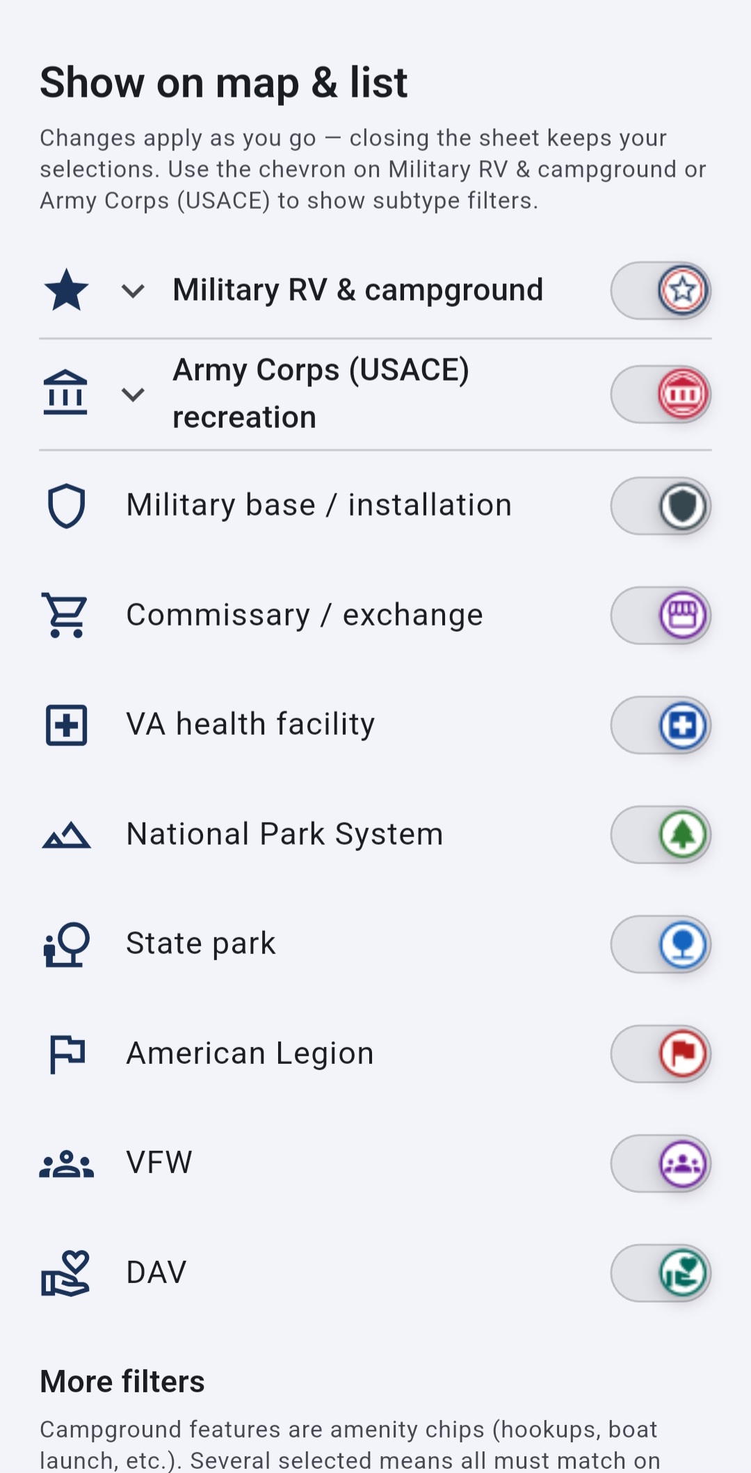 Discover 1000+ FamCamps, ACE Camps, National Parks, and veteran-friendly RV locations in one app.
